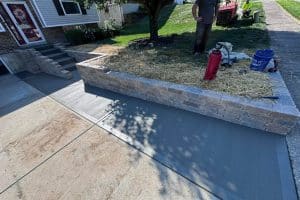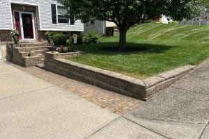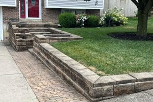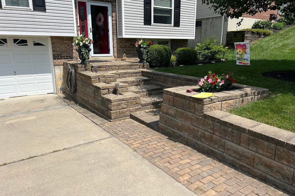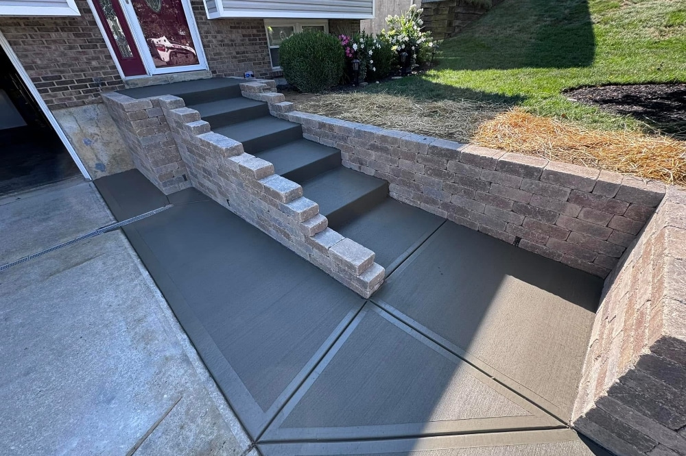 We completed a concrete service project for a home in Florence, Kentucky. Our customer had walls and steps that were failing and were not safe. The home owners were worried about older people safely accessing the front door. There were also concerns that the bottom step was holding water. Our team removed the current steps and walls, as well as installed a new Brussels dimensional block and new concrete.